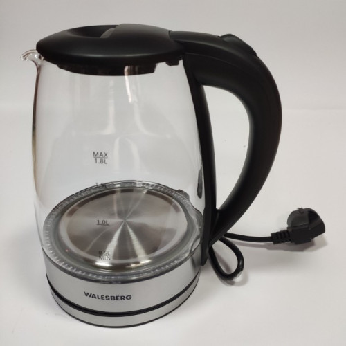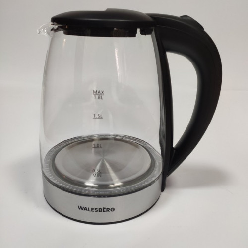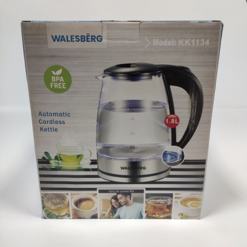 Дана модель електрочайника може обертатися на 360 градусів на своєму цоколі та оснащена світловою індикацією роботи, а корпус стійкий до дії високих температур. Корпус Walesberg KK-1134 виготовлений зі скла високої якості. Модель чайника має зручну та обтічну форму ручки.