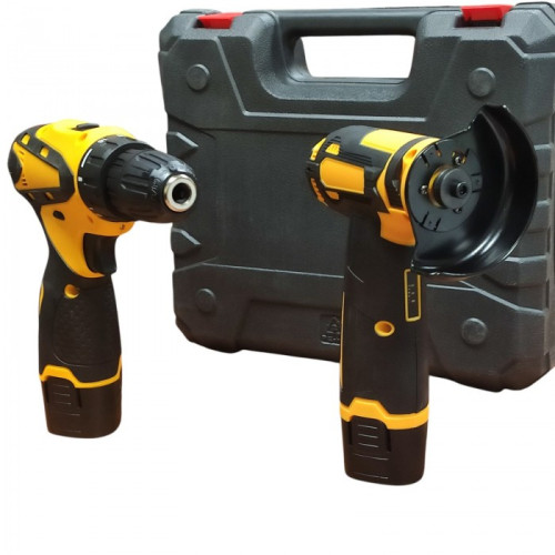 Набор состоит из мини-болгарки и аккумуляторного шуруповерта 12V. Мини-болгарка предназначена для резки, шлифовки и зачистки материалов, шуруповерт обеспечивает сверление и закручивание креплений в древесине, пластике и металле. Набор комплектуется двумя аккумуляторами и зарядным устройством.