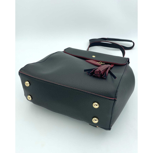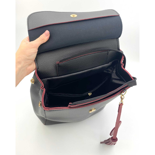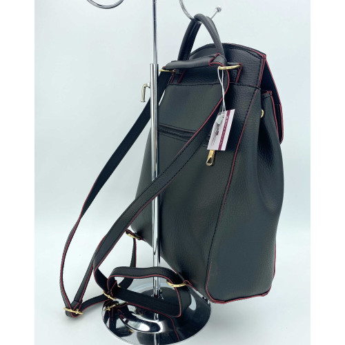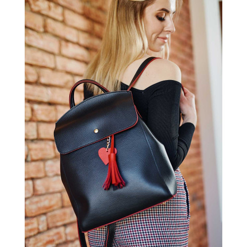Жіночий рюкзак сумка 44606 від виробника «Welassie» Україна, колір чорний з червоним, матеріал морозостійка, еластична та міцна екокожа високої якості. Основне відділення застібається на блискавці, на бічних частинах рюкзака встановлені кнопки максимального закривання. Усередині є нашита косметичка, яка ділить сумку рюкзак на два відділення, а також дві кишені для дрібних предметів. Є зовнішня кишеня на застібці. Ремінці регулюються, за рахунок чого модель швидко перетворюється з сумки на рюкзак і навпаки. Під кришкою є магніт. Сумка прикрашена аксесуаром у вигляді серця на ланцюжку та пензлика на карабіні, за бажанням карабін легко знімається. Розмір розрахований на формат А4. Сумка-рюкзак укріплена знизу щільним матеріалом, є 4 хольнітени, за рахунок чого сумку можна ставити на підлогу. Ручки щільно пришиті та додатково укріплені, тому сумка рюкзак з легкістю витримує навантаження.